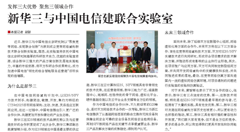 發(fā)揮三大優(yōu)勢 聚焦三領(lǐng)域合作 新華三與中國電信建聯(lián)合實驗室(《通信產(chǎn)業(yè)報》)